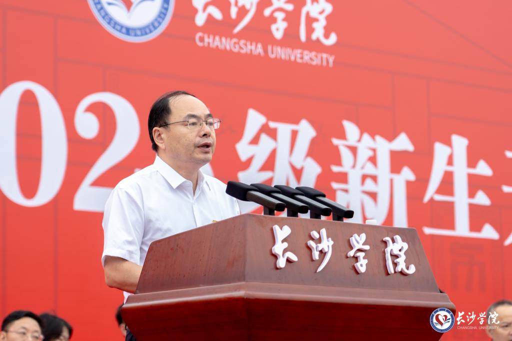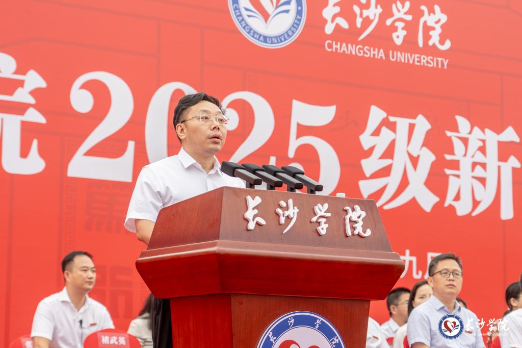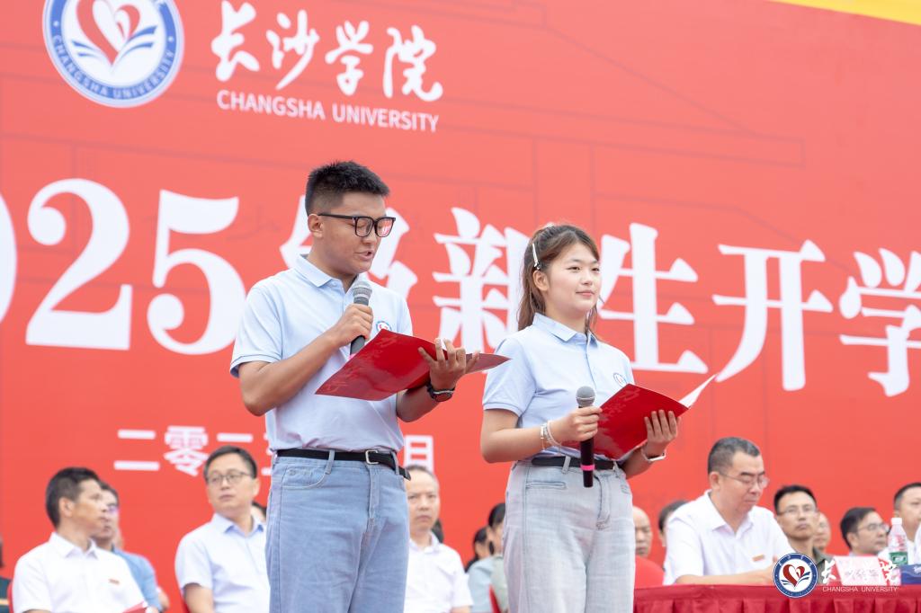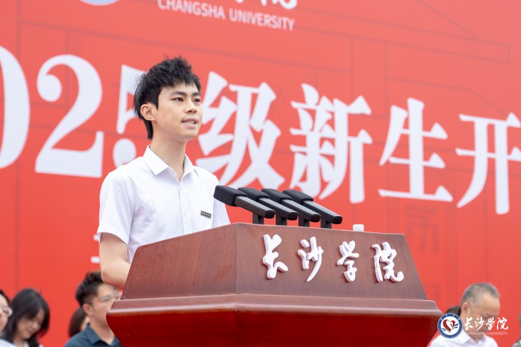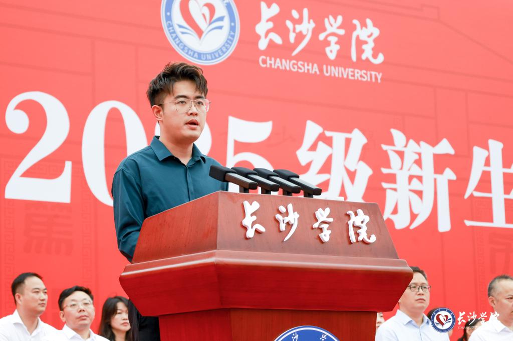 老生代表、外国语学院22级翻译专业陈逸凡借用学校的英文缩写“CCSU”四个字母,结合自身参与学科竞赛、志愿活动等经历,向新生分享了四个大学成长关键词:“C”分别代表追求卓越和团结协作,“S”为服务奉献,“U”指使命担当,呼吁新生将个人成长融入国家发展,为强国建设、民族复兴贡献青春力量。