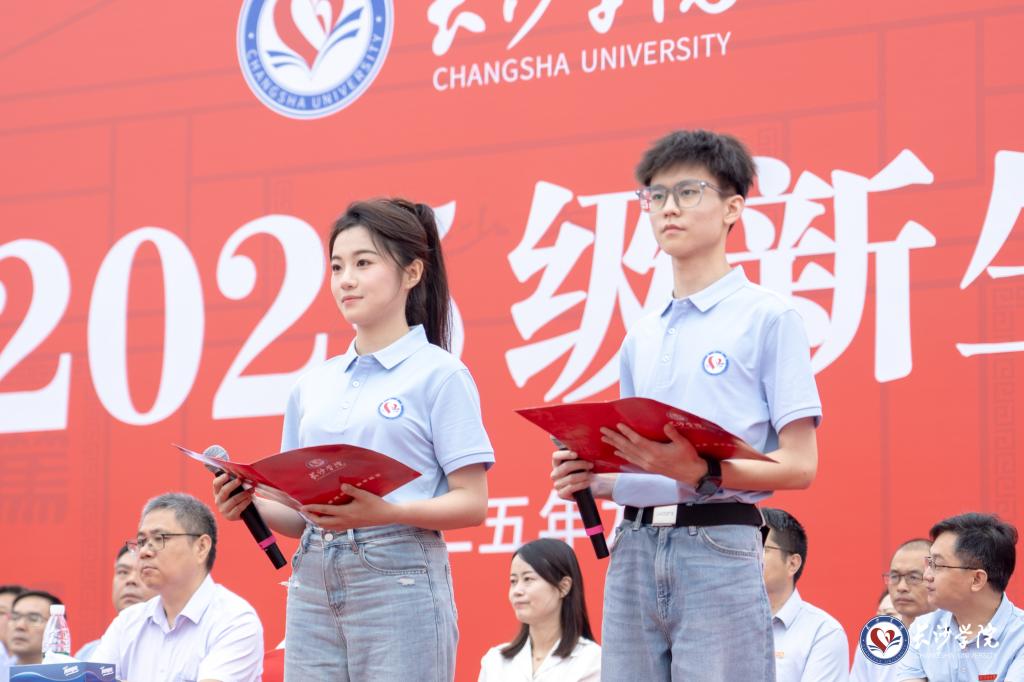 土木工程学院李彤、经济与管理学院次旺加措、法学院张宇喆、马栏山新媒体学院陈映妤作为新生代表发言。来自湖南邵东、西藏那曲、福建福州、湖南长沙的他们结合自己的家乡与专业背景,畅谈了对大学生活的规划和认知,表示将带着家乡赋予的精神品质勤奋自勉,学好专业知识、拥抱行业变革、助力家乡发展,在长大这片沃土上力学笃行,用奋斗书写青春篇章。