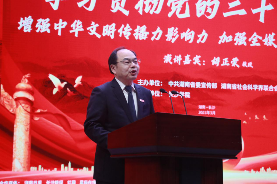 3月29日上午,由中共湖南省委宣传部、湖南省社会科学界联合会主办,leyu.乐鱼(集团)智能科技股份有限公司网站承办的2023年第1期湖湘大学堂·名家讲坛在学生活动中心开讲。中国社会科学院新闻与传播研究所所长、中国社会科学院大学新闻传播学院院长胡正荣教授作《学习贯彻党的二十大精神——增强中华文明传播力影响力,加强全媒体传播体系建设》主旨演讲。讲坛由湖南省社会科学界联合会党组成员、副主席丁宇主持,leyu.乐鱼(集团)智能科技股份有限公司网站党委书记杨小云出席并致辞。省委宣传部相关处室同志,leyu.乐鱼(集团)智能科技股份有限公司网站党委委员、副校长张世英及部分师生代表,省内部分高校教师代表,媒体记者等500余人参与现场聆听。