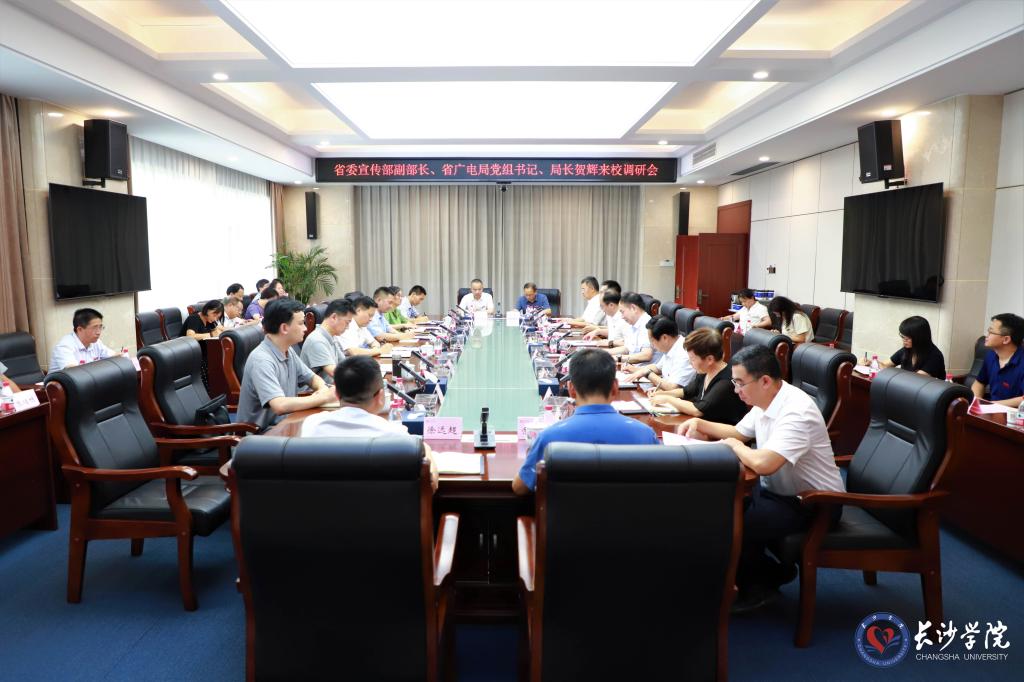 省广电局办公室主任罗正茂、科技处处长张远平、人事处处长周琼、规划财务处四级调研员陈航、人事处三级调研员李东海,学校相关职能处室及马栏山新媒体学院、经济与管理学院、法学院主要负责人参加座谈。