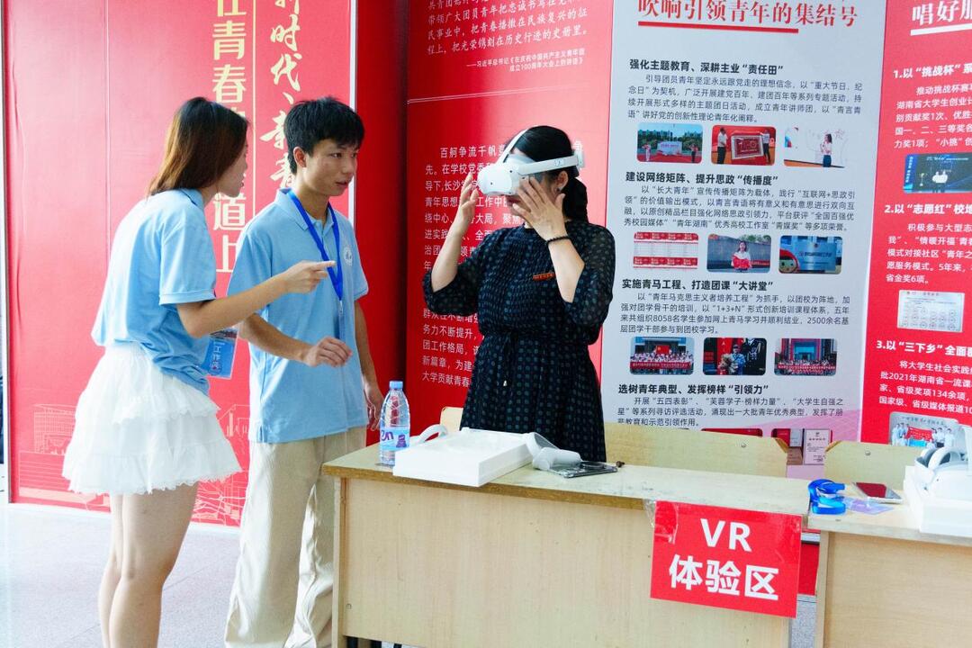 迎新现场,各二级学院纷纷亮出“特色招牌”,以创意十足的迎新方式为新生及家长带来别样体验。生物与化学工程学院将廉洁与心理元素融入迎新大礼包,助力新生扣好大学第一粒扣子;艺术设计学院和土木工程学院将学生优秀设计作品搬到了迎新现场,计算机科学与工程学院派出了机器人和机器狗,让新生对未来的专业学习有了更直观的感受;经济与管理学院的迎新点主打“科技感”,新生和家长戴上VR体验设备,即可通过虚拟场景“云游”张家界,生动展示了学院在数字人文与虚拟旅游领域的扎实探索与优秀成果。