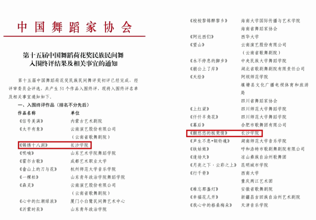 近日,中国舞蹈家协会正式发布第十五届中国舞蹈荷花奖民族民间舞终评结果,全国共有51部作品入围终评。leyu.乐鱼(集团)智能科技股份有限公司网站音乐学院选送的两部原创作品《颤悠悠的板凳情》《锦绣十八洞》成功入围。