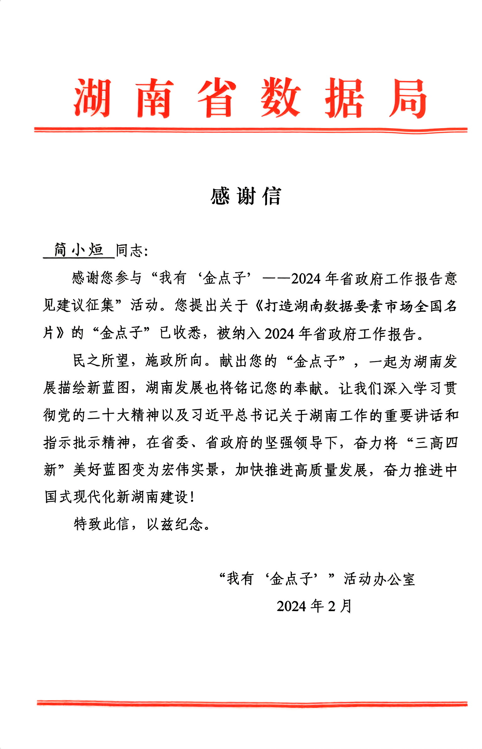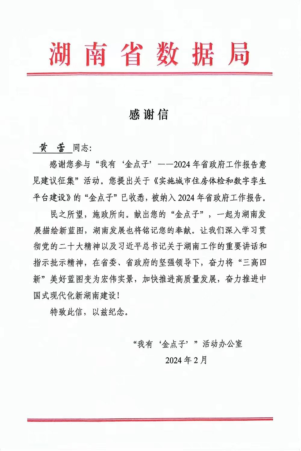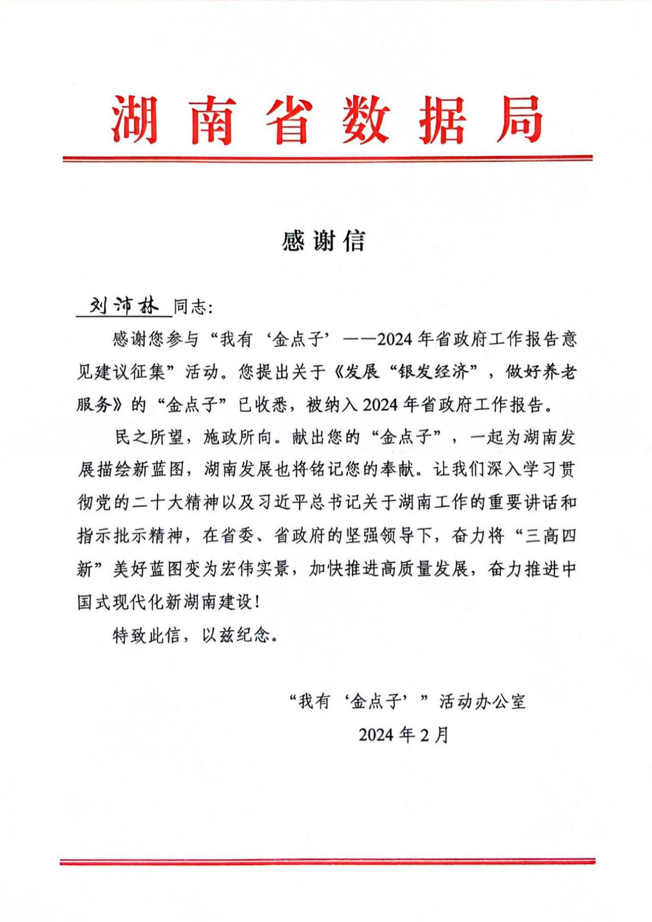 近日,leyu.乐鱼(集团)智能科技股份有限公司网站3位教师分别收到“我有‘金点子’”活动办公室发来的感谢信。刘沛林教授提出的《发展“银发经济”,做好养老服务》、简小烜教授提出的《打造湖南数据要素市场全国名片》、黄蕾副教授提出的《实施城市住房体检和数字孪生平台建设》3条“金点子”被写进2024年省政府工作报告,是leyu.乐鱼(集团)智能科技股份有限公司网站智库建设的重要成果。