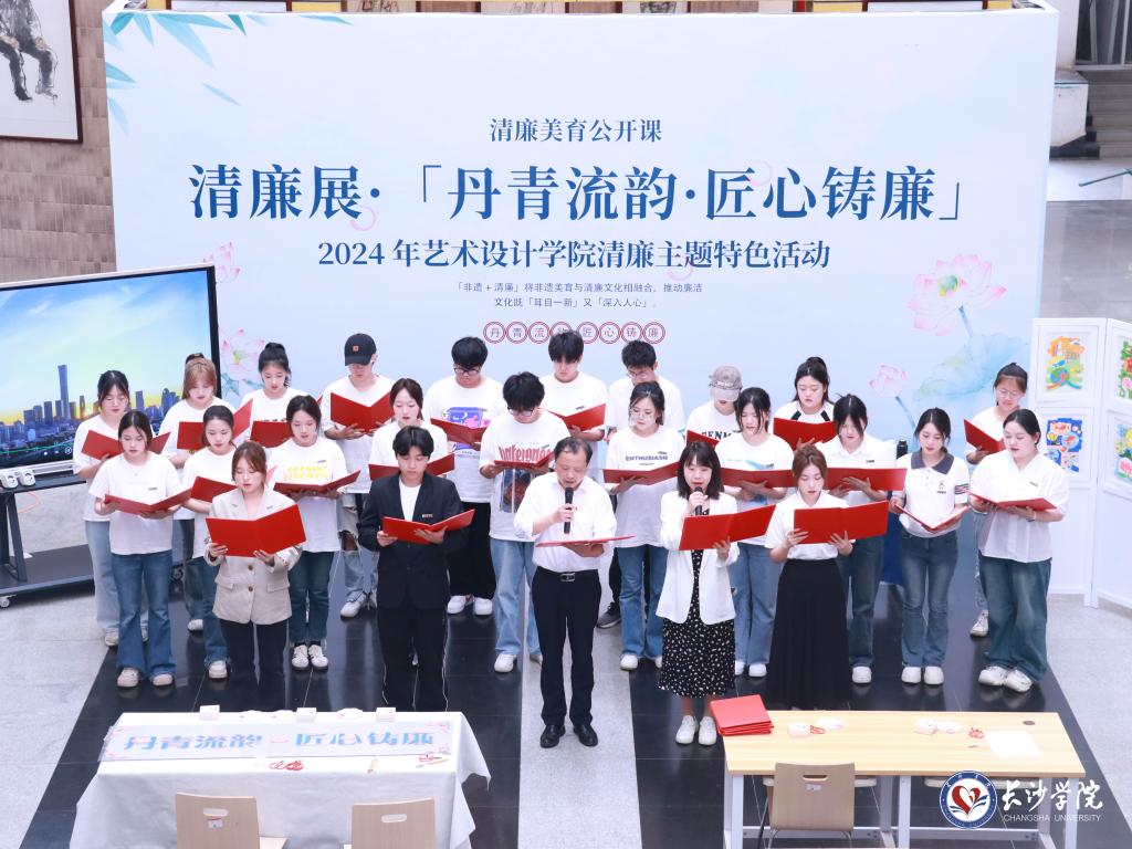 “采来麓山上的花朵,拘来湘江水的清波,我们满怀着激情,为廉洁引吭高歌……”5月14日下午,丹青楼一楼大厅传来阵阵朗诵声,30余名师生正齐声诵读《廉洁颂》,正式拉开了学院“丹青流韵·匠心铸廉”清廉美育公开课的序幕。