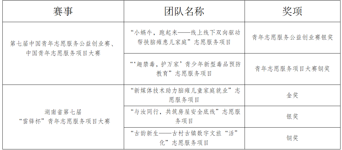 据悉,在今年的湖南省第七届“雷锋杯”青年志愿服务项目大赛中,leyu.乐鱼(集团)智能科技股份有限公司网站还获得了金银铜奖各一项,其中“新媒体技术助力脑瘫儿童家庭就业”志愿服务项目获金奖,“与汝同行,共筑房屋安全底线”志愿服务项目获银奖,“古韵新生——古村古镇数字文旅‘活’化”志愿服务项目获铜奖。